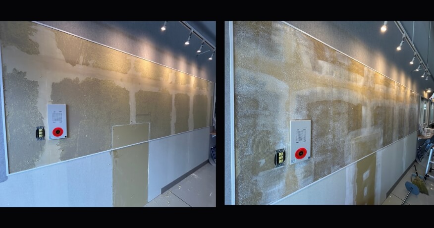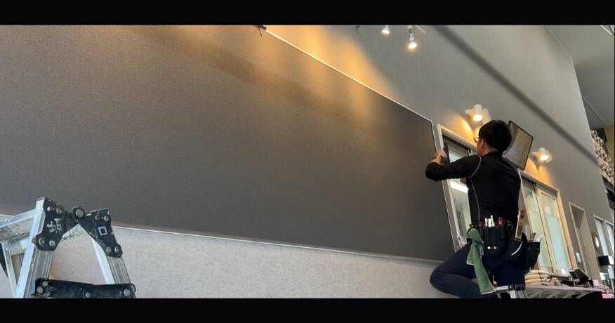 掲示板クロスは基本的に継ぎ目を入れずに貼るのが一般的な工法で、今回は写真のように継ぎ目を作らず、