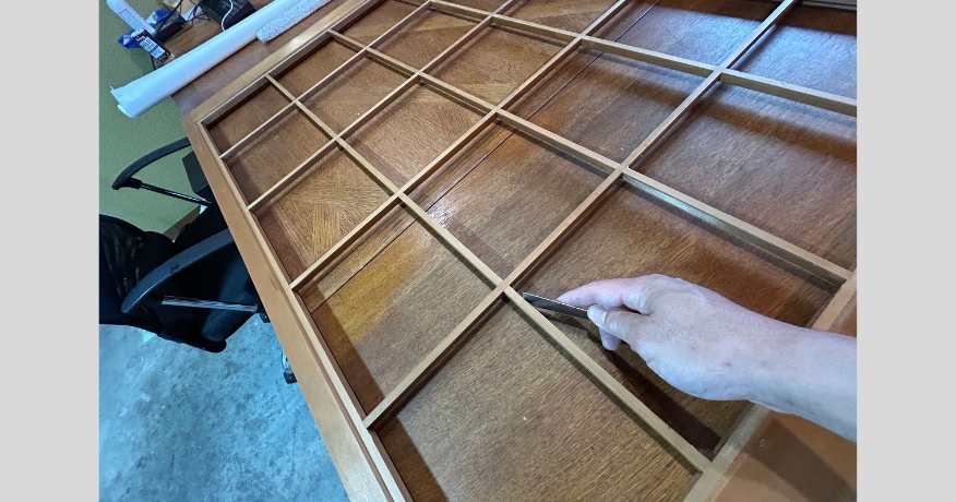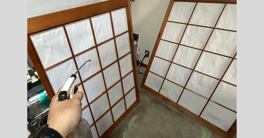 骨組みの部分をヘラで丁寧に削って整えます。4.障子用の糊を塗布 障子紙を転がして張りこみ